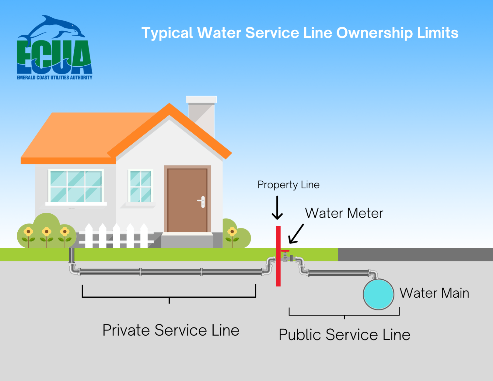 The ownership and responsibility are divided between the property owner and the utility, with the dividing line being the water meter. The water meter is typically located in your front yard. ECUA is responsible for the service line from the water main in the street to the meter. The property owner is responsible for the service line from the meter to the home or business.
